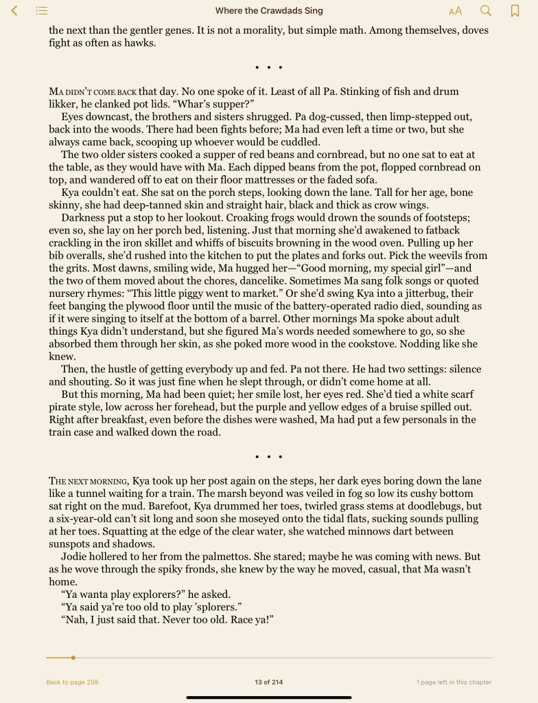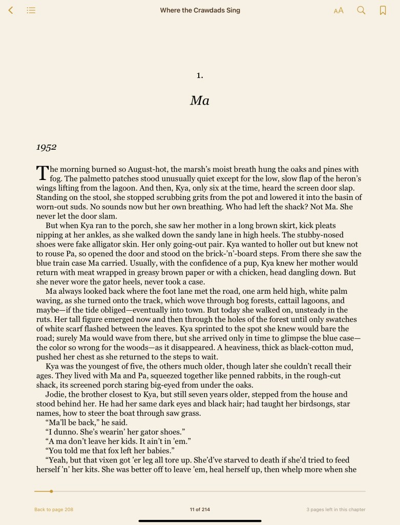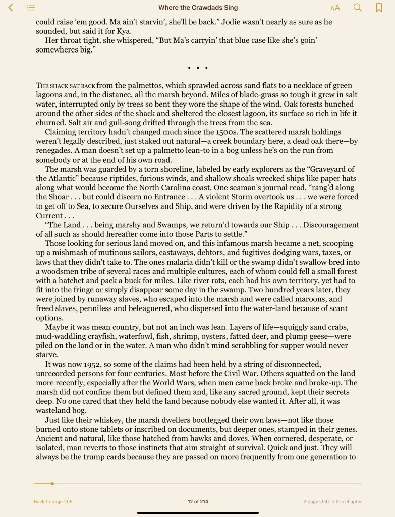 The writing style is beautiful and poetic—it feels like a song or a poem rather than a novel at times. There are moments when the language is so vivid and descriptive that you can almost picture yourself there in the marshlands with Kya as she experiences her life-changing events. It’s clear that Delia Owens has put a lot of effort into creating an immersive story that readers can connect with emotionally.