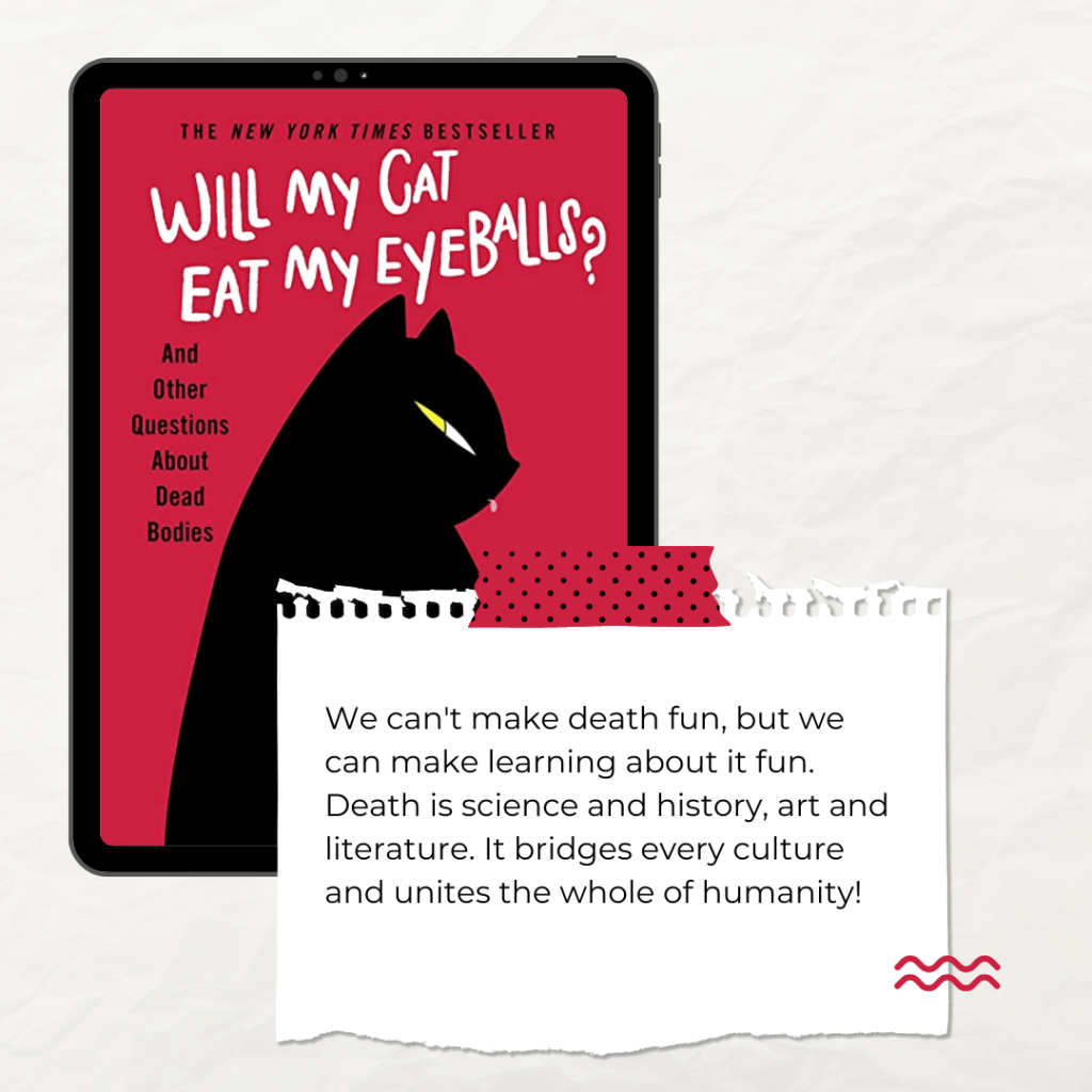 Overall, I highly recommend Will My Cat Eat My Eyeballs? And Other Questions About Dead Bodies. It’s a captivating and informative look at a subject that many of us shy away from. Doughty’s writing style is engaging and relatable, and her insights into death positivity are thought-provoking. Whether you’re fascinated by death or just looking for a unique read, this book is worth picking up.